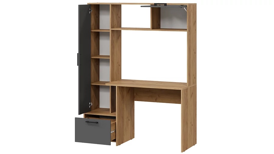 • Дизайн. Дизайн стола выполнен в трендовом сочетании текстур «Дуб Крафт Золотой» и «Графит Серый». Цвет фасада обладает спокойным серым оттенком, который охлаждает атмосферу, а медовые оттенки каркаса добавляют теплоты и изысканности в интерьер. Цвет мебели в сочетании с черной лицевой фурнитурой является отличным вариантом для создания стильного интерьера.