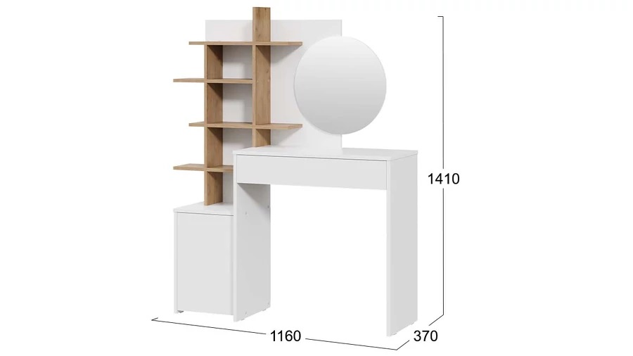 Функциональность. Помимо внешней привлекательности, стол достаточно вместителен. Конструкцией предусмотрено большое круглое зеркало, просторная столешница и практичный выдвижной ящик, который добавит места для необходимых мелочей. Стол также имеет открытые полки, которые позволят установить предметы декора, парфюм, украшения и многое друге.