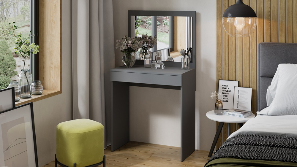 Функциональность. Несмотря на свои компактные размеры, туалетный стол имеет функциональный ящик с шариковыми направляющими для хранения парфюмерии, украшений и многого другого, достаточно вместительную столешницу, где можно разместить все необходимые аксессуары и полноценное зеркало. В этом туалетном столике нет ничего лишнего, только самое необходимое для уголка женской красоты.