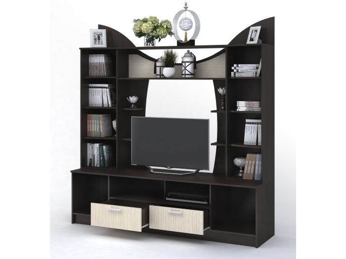 Центральная секция Ольбия является замечательным и достаточно практичным дополнением общего интерьера уютной гостиной. Специальная подставка создана для размещения телевизора для более комфортного просмотра, а открытые ниши - для необходимой аппаратуры. За стеклянными дверцами и на открытых полках будут отлично смотреться наборы посуды, коллекция дорогих напитков, интересные книги, семейные фотографии и различные предметы декора. Выдвижные ящики и отделения с дверцами пригодятся для хранения более ценных и важных вещей. Мебель Ольбия приятно удивит элегантностью, а особый рисунок на фасаде привлекает изящностью, не оставляя никого равнодушным.