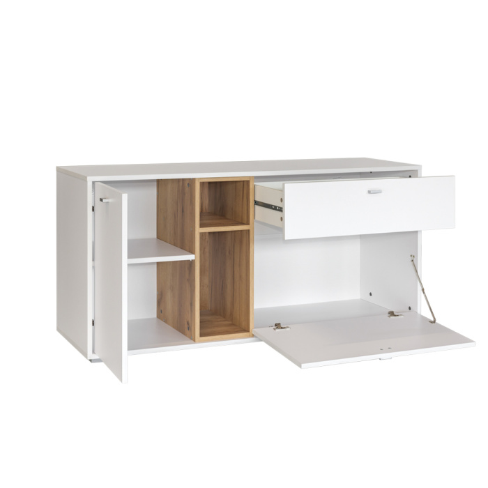 Распашные двери на четырехшарнирных петлях. Выдвижной ящик на шариковых направляющих.