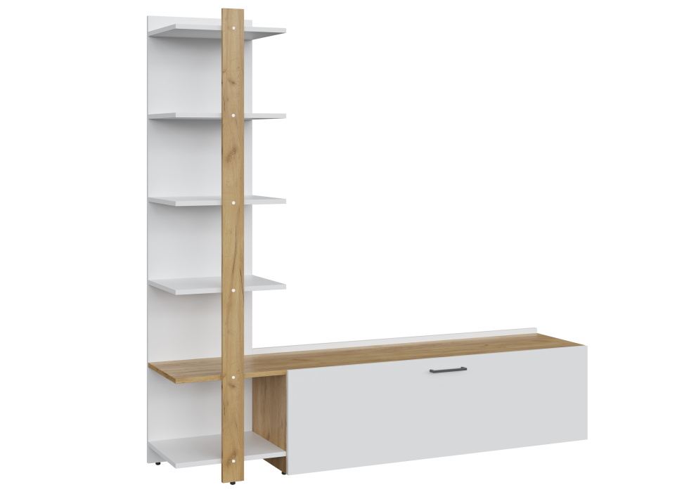 1. Блок с полками. Состоит из щита, одного внешнего бока и пяти полок. Пересекается в нижней своей части единой с тумбой столешницей. Щит и 5 полок выполнены в белом цвете, столешница и внешний бок — в цвете Дуб Крафт золотой. Размеры: полок 385х330мм, внешнего бока 74х1560мм, щита 385х1560мм. Расстояние между полками 272мм. Отступ верхней полки от верхнего края щита 56мм. Расстояние нижней полки до столешницы 259мм. Полка под столешницей крепится также к корпусу тумбы при помощи евростяжек.