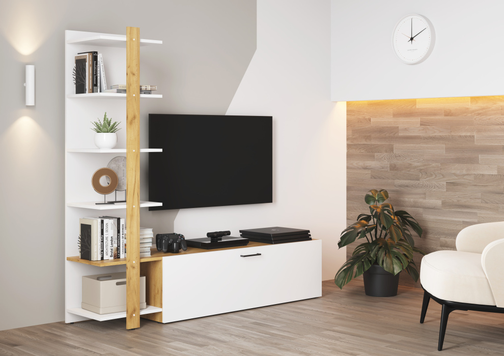 2. Тумба ТV.Габаритные размеры: 1214х372х362 мм. Закрыта единым фасадом, имеющим барный механизм открывания. Имеет внутреннюю перегородку, разделяющую тумбу на две равные части, и две несъемные внутренние полки. Нагрузка на тумбу - не более 30кг при равномерно распределённых статичных нагрузках. Столешница тумбы: ЛДСП — Дуб Крафт золотой. Размер 1600х362мм. Кромка 0,4 мм по 4-ем сторонам. Задняя панель столешницы: цвет — белый гладкий. Выступает относительно плоскости стола на 20мм вверху.