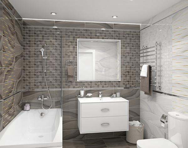 переходами оттенков. Настенная плитка представлена в трёх утончённых цветах – кофейном, светлом и сером. Агат не требует броских украшений, поэтому декоры только добавляют необходимые акценты.Псевдомозаика представляет собой разнонаправленные слои минерала. Декор Lines с контрастными линиями добавит ритмичность и динамику в интерьер. Модуль Geo покрыт геометрическим орнаментом в шахматном стиле, но вместо чёрно-белых квадратов на плитке изображены ромбы с рисунком агата и полосатым узором.