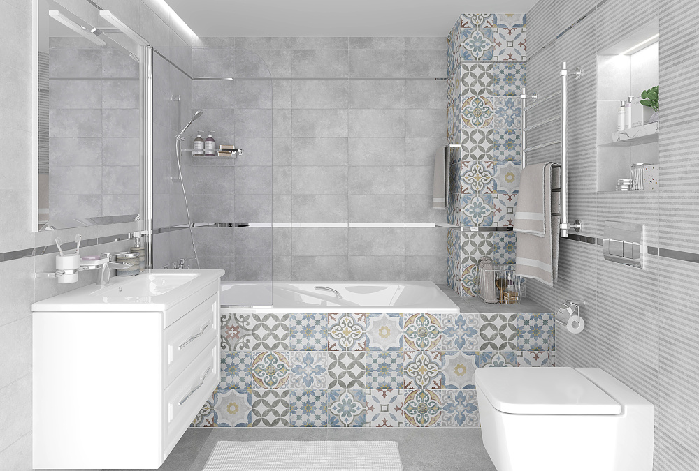 Большая коллекция и настоящий простор для полета вашей фантазии! Ее основа - нежные пастельные тона и мотивы лоскутного шитья. Базовая плитка в сером и бежевом цвете (доступно по 2 оттенка: светлый и темный) станет замечательным фоном для декоров. Они выполнены в двух стилях: пэчворк и геометрия. Причем, мы старались сделать их такими, чтобы они смотрелись органично не только в виде полосы-акцента, но и как контрастное оформление для целой стены или большей ее части. А для логического разграничения в коллекции есть четыре металлических бордюра: два под золото и два под серебро. Они помогут сбалансировать приглушенную цветовую гамму керамогранита.