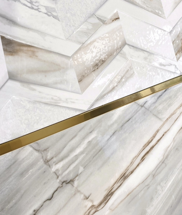 Глянцевая поверхность имеет рисунок под камень, под мрамор. Эта плитка применяется для облицовки стен внутренних помещений: ванной, туалета. Настенная плитка имеет ректифицированные края, дающие возможность «бесшовной» укладки.
