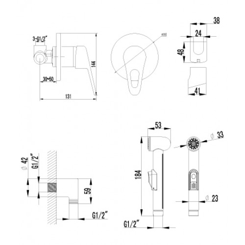 Аксессуары в комплекте (лейка для биде с кнопочным приводом, шланг 1,5 м., настенное крепление для лейки)