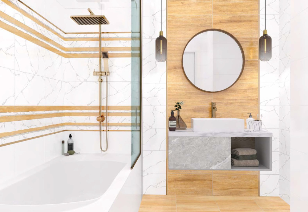 Глянцевая поверхность имеет рисунок под дерево. Эта плитка применяется для облицовки стен внутренних помещений: ванной, туалета.