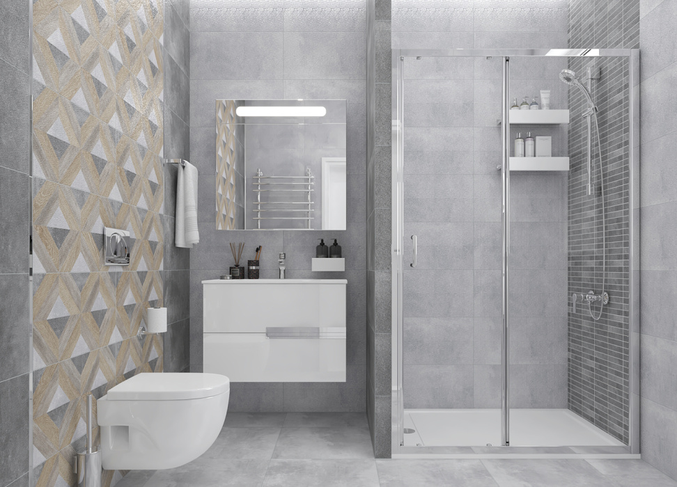 Поверхность имеет рисунок под дерево, под бетон, с орнаментом, геометрический узор. Эта плитка применяется для облицовки стен внутренних помещений: ванной, туалета.