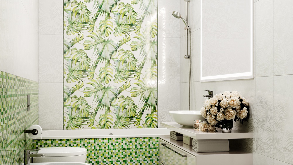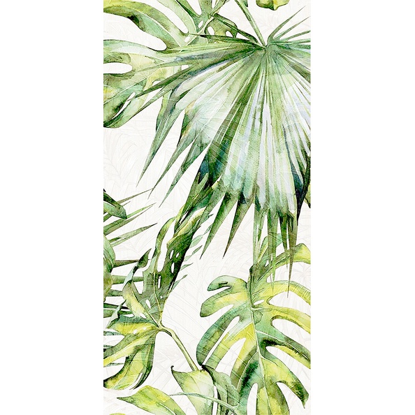 Коллекция привнесет в интерьер нотку экзотики. Тропический рай можно создать, используя декор массив из зеленых листьев, который вполне способен заменить в интерьере живые растения. А коричневые пальмовые листья и плитка в бежевых тонах, по рисунку напоминающая стилизованные верхушки цветков, придадут помещению восточный колорит и аромат.
