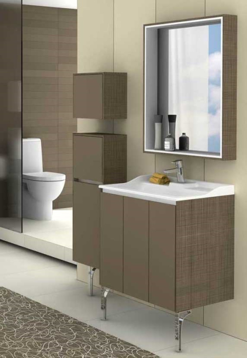 Это функциональная модель, выпускаемая в широкой цветовой гамме с раковинами из литого мрамора. Изящные формы раковины, пристенные бортики и площадки делают ее очень удобной даже в небольших размерах. За левым фасадом встроен небольшой скрытый ящик. Корпус зеркала, также как и корпуса остальных изделий коллекции, имеет двойную конструкцию. Зеркало оснащено подсветкой. Светильник снабжен сенсорным выключателем, встроенным под стекло, закрывающее светящуюся LED-ленту и имеющее специальное матовое покрытие, обеспечивающее равномерное свечение. Дополнительные системы хранения – шкафы различной конфигурации, которые можно компоновать по своему желанию. Опционально (отдельной позицией) для тумбы и полуколонны можно приобрести комплект глянцевых хромированных мебельных опор итальянского производства (h=220мм). Внутренняя отделка всех изделий коллекции – декоративная текстурированная ДСП. Вместо ручки установлен изящный профиль, который позволяет открыть фасад.