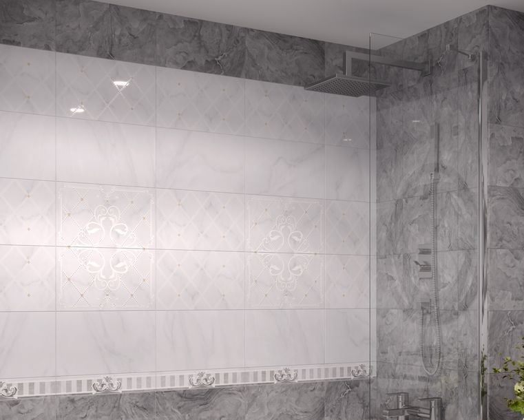 Поверхность имеет рисунок с орнаментом, геометрический узор. Эта плитка применяется для декорирования стен внутренних помещений: ванной, туалета.