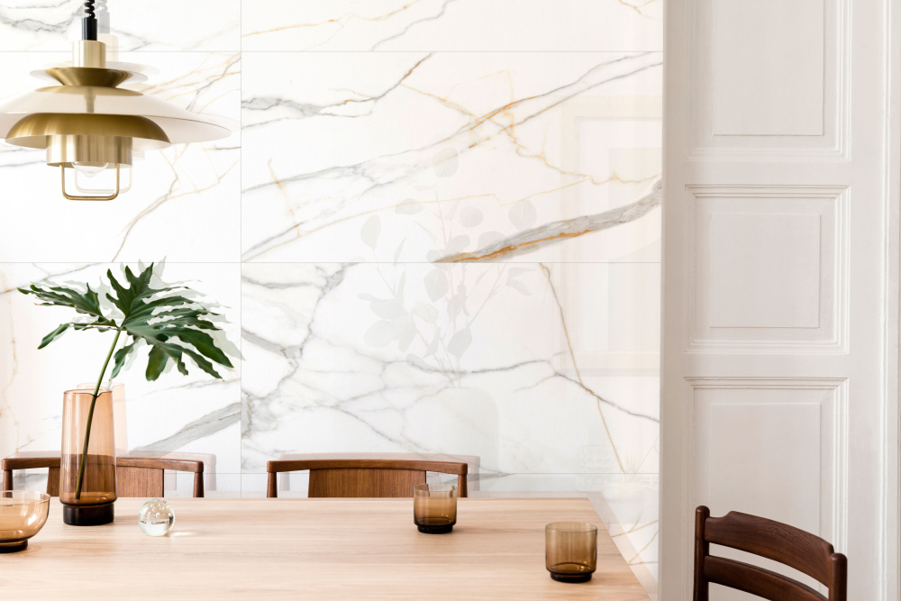 Изысканная коллекция керамогранита Montecatini имитирует текстуру мрамора. На белом фоне плиты пересекаются тонкие серые и золотые прожилки. Благородный рисунок коллекции Montecatini как нельзя лучше вписывается в концепцию неоклассики и привносит в образ атмосферу сдержанной элегантности, но без ущерба для практичности. Керамогранит Montecatini идеально сочетается с деревом, серыми и бежевыми оттенками мрамора, металлом, дополняя интерьер естественностью и лаконичностью.