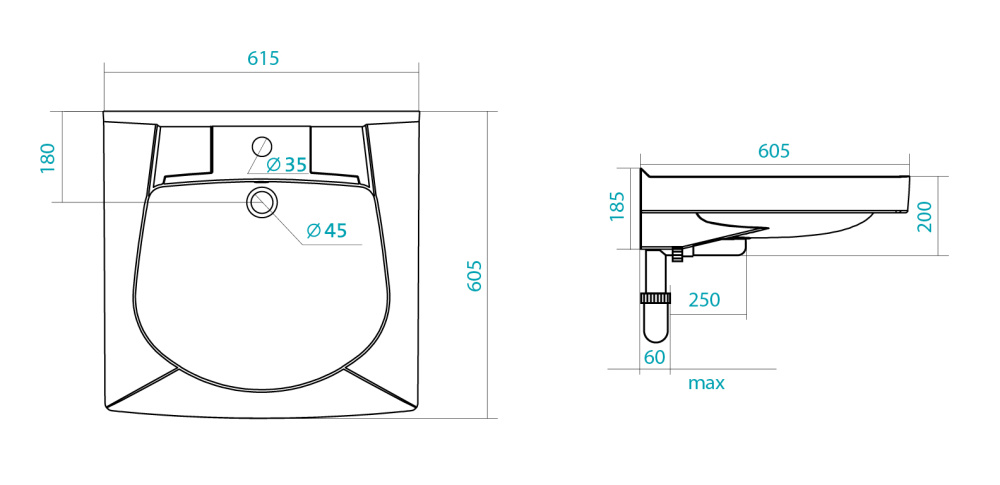 Умывальник 50 см c кронштейном, крепежом и сифоном.