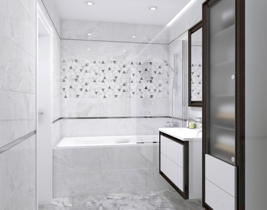 Базовая настенная плитка Plazma от Laparet предложена в гамме из белых, серых и зеленых оттенков. Мраморная структура имеет довольно активный, насыщенный прожилковый рисунок, поэтому крупноформатные модули могут использоваться совсем без декоров и при этом интерьер не будет скучным, но всё же дизайнеры включили в линейку ассортимент декораций.Вставки Avers оформлены орнаментом из треугольников, некоторые из которых проработаны серебристой и золотистой глазурью. Декоры Nuance украшены скромным узором-сеткой с ячейками «арабский четырехлистник».