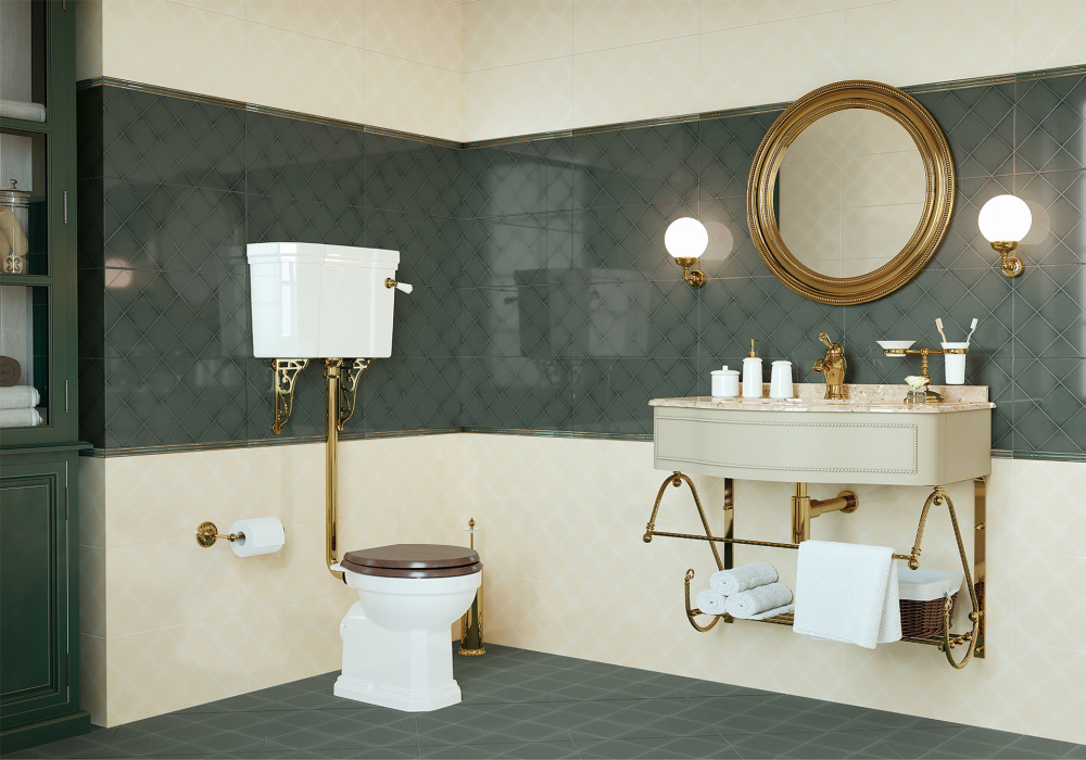 Adele — это строгая и одновременно роскошная коллекция в английском стиле. Глянцевая поверхность, покрытая тонкой паутинкой кракелюра, с легким рельефом в виде ромбов дополнена декором с рисунком «геральдической лилии». А также коллекционный бордюр двух видов, украшенный золотыми вензелями, создаст богатый интерьер в классических благородных цветах.