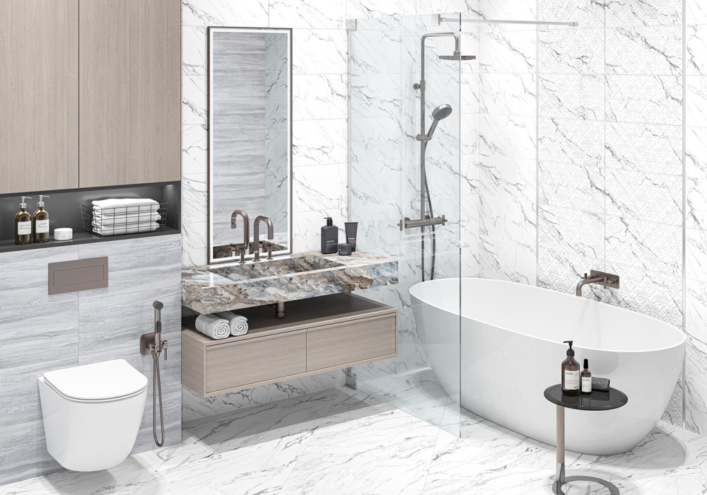 Поверхность имеет рисунок под мрамор, с орнаментом, цветочный орнамент. Эта плитка применяется для облицовки стен внутренних помещений: ванной, туалета.