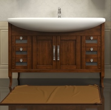 Комплект мебели «Мираж» изготовлен из массива дерева. Он имеет прямоугольные формы, которые разбавлены необычной ножкой и плавными изгибами раковины. В комплект входит зеркало в деревянной раме с подсветкой в козырьке, 2 подвесных шкафчика, тумба с шестью выдвижными ящиками, украшенными матовым стеклом, и двумя открывными дверками, керамическая раковина.