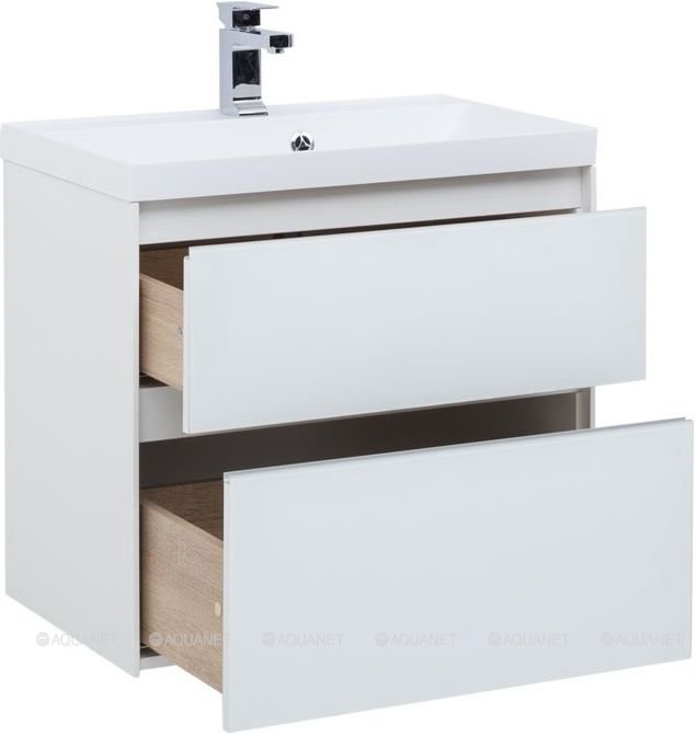 Тумба с раковиной Aquanet Гласс 70 белого цвета смотрится эффектно благодаря сочетанию белого матового стекла на фасаде верхнего выдвижного ящика с белоснежными глянцевыми поверхностями корпуса, выполненного из МДФ. Такое покрытие, к тому же, надежно защищает мебель от воздействия воды. «Изюминку» во внешний вид вносит внутренняя часть выдвижных ящиков, выполненная в цвете «дуб сонома». Древесная фактура вносит свежесть и живописность в дизайн всего изделия.