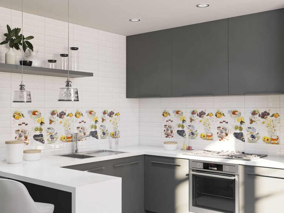 Коллекция керамической плитки Вог - сочетание классической плиты с глянцевой поверхностью и современного декора. Декоры представлены в двух стилистически направлениях, что нашло отражение в названиях декоративных элементов.Особенность данных декоров в возможности выкладки — их можно разместить как единое панно из 4-х плит, так и хаотично в разброс, заполняя всё кухонное пространство