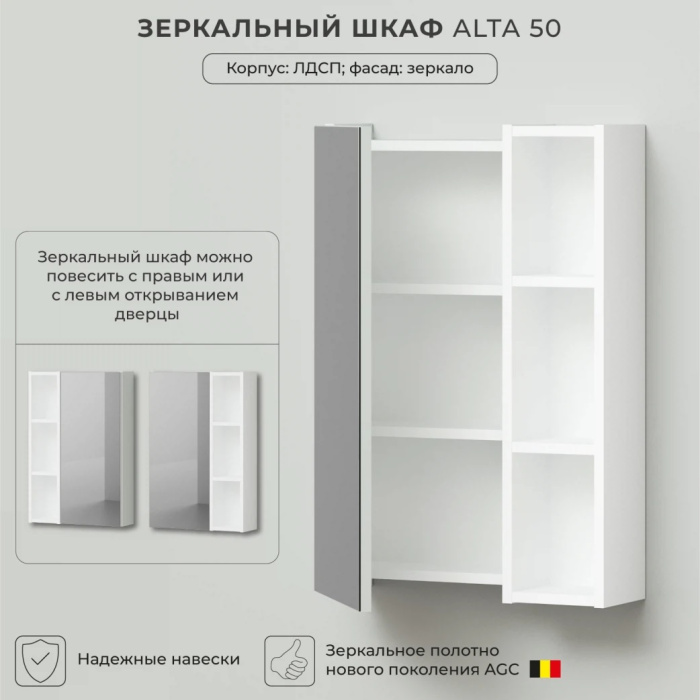 Зеркало шкаф в ванную из коллекции Alta поможет создать комфортные условия в ванной комнате. Шкаф с зеркалом имеет идеально ровную поверхность и дает четкое отражение без искажения. Лаконичный дизайн зеркального шкафа подойдет к интерьеру любой ванной комнаты. В производстве используют только качественные влагостойкие материалы, в составе которых полностью отсутствуют опасные вещества. Корпус и фасад изготовлены из ламинированного ДСП. На открытой нише можно разместить предметы личной гигиены. Дополнить комплект можно изделиями из коллекции Alta.