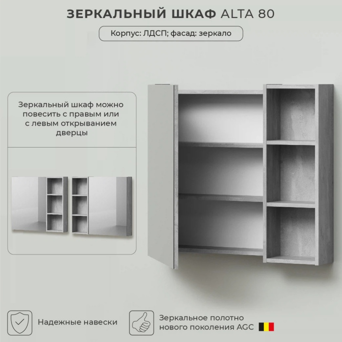 Зеркало шкаф в ванную из коллекции Alta поможет создать комфортные условия в ванной комнате. В качестве цветового решения был выбран актуальный оттенок Бетонный Камень. Шкаф с зеркалом имеет идеально ровную поверхность и дает четкое отражение без искажения. Лаконичный дизайн зеркального шкафа подойдет к интерьеру любой ванной комнаты. В производстве используют только качественные влагостойкие материалы, в составе которых полностью отсутствуют опасные вещества. Корпус и фасад изготовлены из ламинированного ДСП. На открытой нише можно разместить предметы личной гигиены. Дополнить комплект можно изделиями из коллекции Alta.
