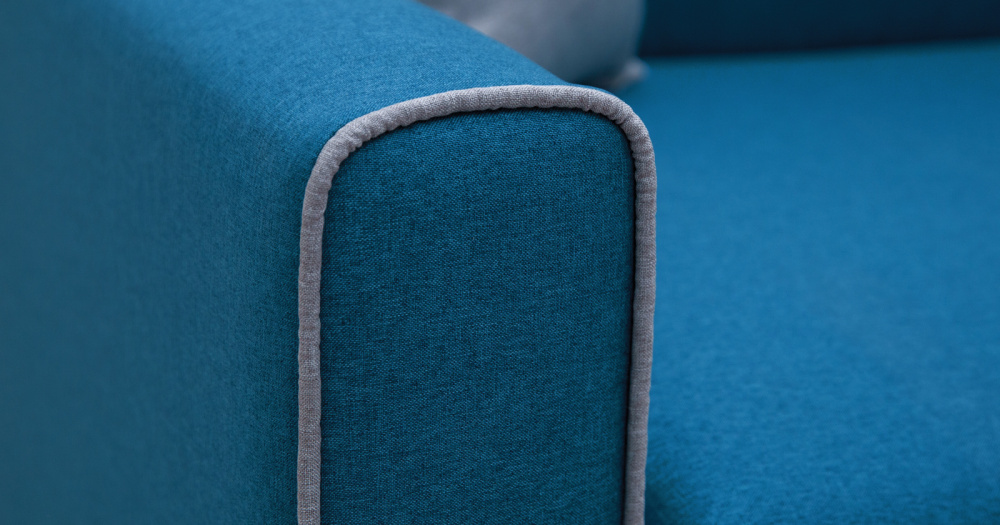 Декоративный контрастный кант по торцу спинки, торцу подлокотника, по верхнему срезу царги. Утяжки с пуговицами на спинке дивана. Две декоративные подушки в контрастной ткани.