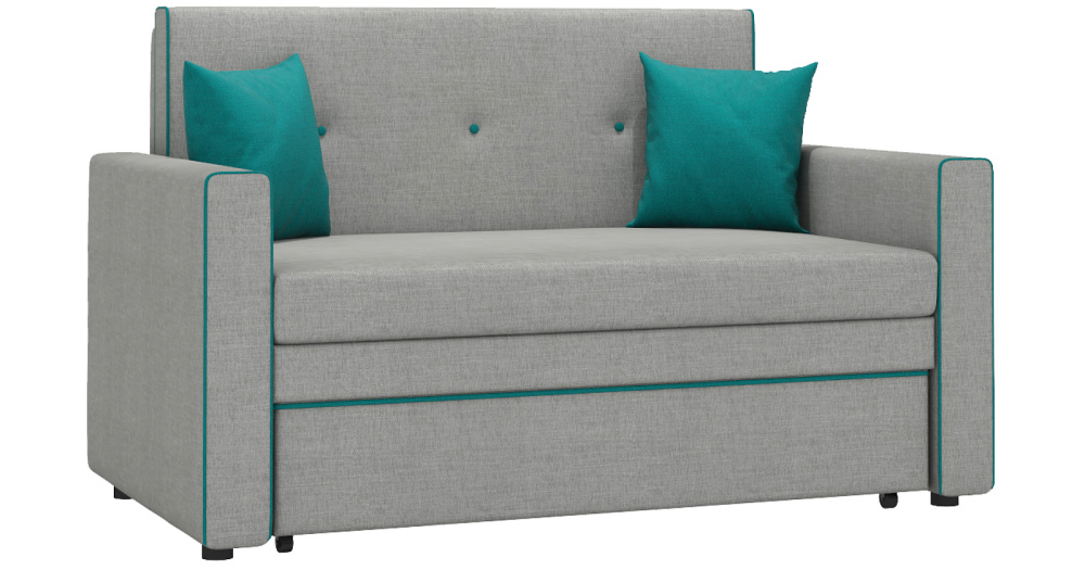 Декоративный контрастный кант по торцу спинки, торцу подлокотника, по верхнему срезу царги. Утяжки с пуговицами на спинке дивана. Две декоративные подушки в контрастной ткани.