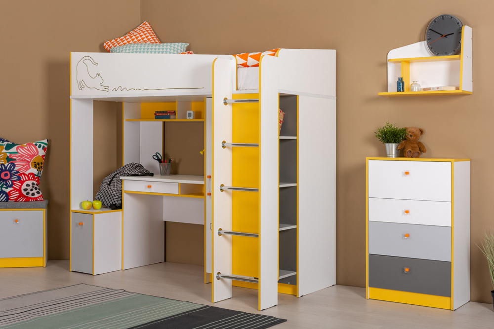 Кровать-чердак Альфа — многофункциональный комплекс для обустройства детской комнаты. Дополнительный раскладной модуль на нижнем ярусе обеспечит спальным местом второго ребенка или послужит комфортным местом отдыха в дневное время. Шкафчики и полки помогут организовать хранение одежды и игрушек.