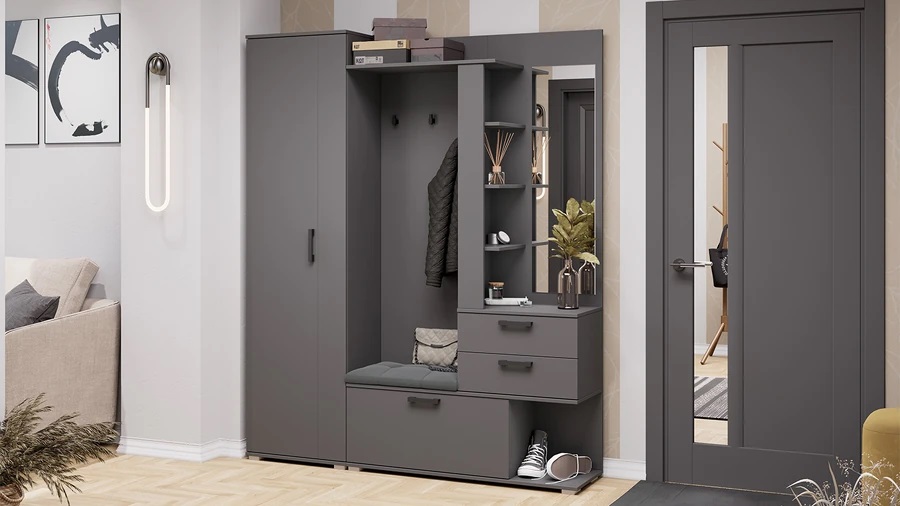 • Модульность. Прихожая оснащена комбинированной вешалкой, которая включает в себя крючки для одежды в цвет лицевой фурнитуры, мягким сидением, небольшим зеркалом, закрытыми и открытыми отсеками для хранения разных предметов. На верхней полке можно расположить головные уборы, а на нижней другие необходимые аксессуары или обувь. Наличие шкафа позволит решить проблему с размещением сезонной одежды.