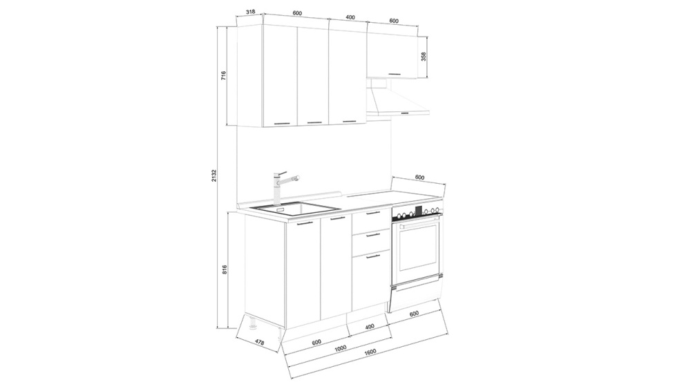 • Габаритный размер готового набора модулей с учетом газовой плиты на 60 см: 1 600