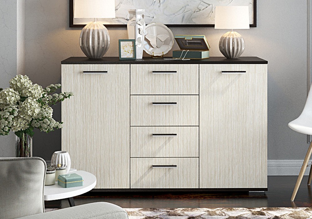 Комод №2 Стендмебель станет гармоничным дополнением интерьера любой комнаты. Отделения с полками, скрытые за дверьми, и четыре достаточно вместительных выдвижных ящиков пригодятся для хранения одежды, постельного и нижнего белья, различных аксессуаров, косметики и украшений. Сверху на комоде можно разместить интересные книги, семейные фотографии, вазу или вазон с цветами, статуэтки и другие предметы декора.