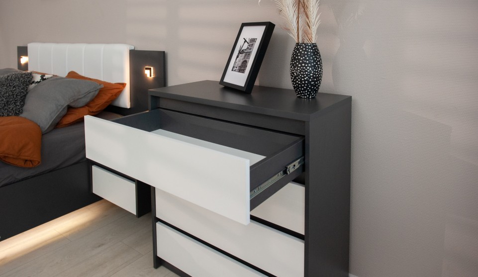Современный функциональный комод «Мишель» с четырьмя выдвижными ящиками обеспечит удобное хранение одежды, предметов декора, книг, посуды. Современные цвета декора корпуса и белоснежный фасад добавят в жилое помещение света, уюта и комфорта. Отсутствие лицевой фурнитуры в ящиках подчеркивает минимализм дизайна. Благодаря простоте форм и классической расцветке подходит для многих интерьеров.