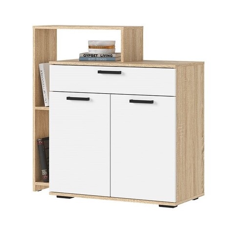 Комод КМ 01 Санса - это компактный и стильный элемент хранения, идеально подходящий для гостиной, спальни или прихожей. Модель оснащена двумя распашными дверцами, вместительным ящиком и открытыми боковыми секциями для книг, декора или мелочей. Лаконичный дизайн с контрастом белых фасадов и светлой древесной текстуры делает комод универсальным решением для современного интерьера.