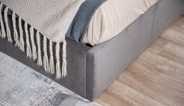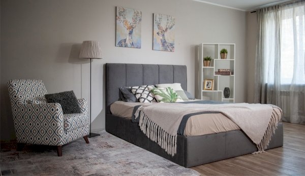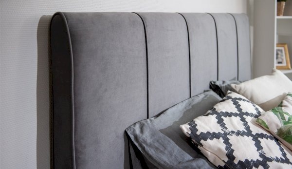 Современная удобная и эргономичная кровать с высоким мягким изголовьем, декорированным вертикальными кантами, создает в спальне комфортную и уютную атмосферу. Практичная мягкая ворсистая поверхность обивки ярких цветов, вызывающая приятные тактильные ощущения, идеально точно повторяет силуэт конструкции кровати, украшает и облагораживает спальню.