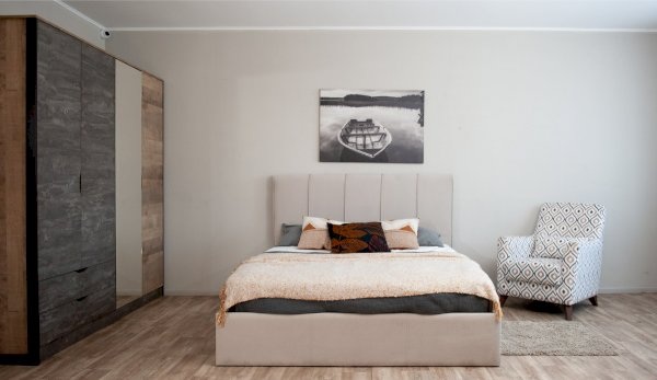 Современная удобная и эргономичная кровать с высоким мягким изголовьем, декорированным вертикальными кантами, создает в спальне комфортную и уютную атмосферу. Практичная мягкая ворсистая поверхность обивки ярких цветов, вызывающая приятные тактильные ощущения, идеально точно повторяет силуэт конструкции кровати, украшает и облагораживает спальню.