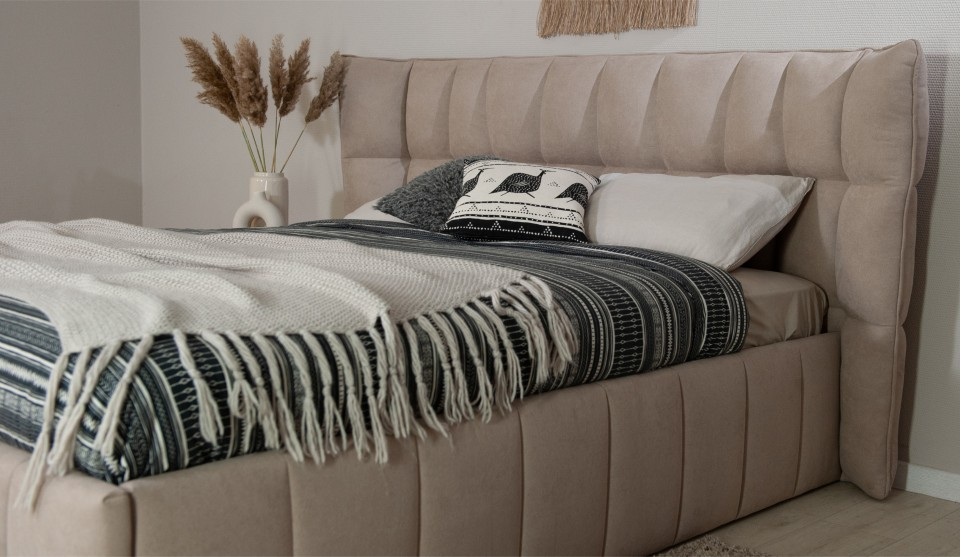 Современная кровать с роскошным изголовьем оригинальной формы с изогнутыми краями украсит интерьер спальни, подчеркнет утонченный вкус владельца. Стилистический акцент – очень глубокая несимметричная стяжка изголовья, создает в комнате максимально уютную атмосферу, располагает к отдыху.
