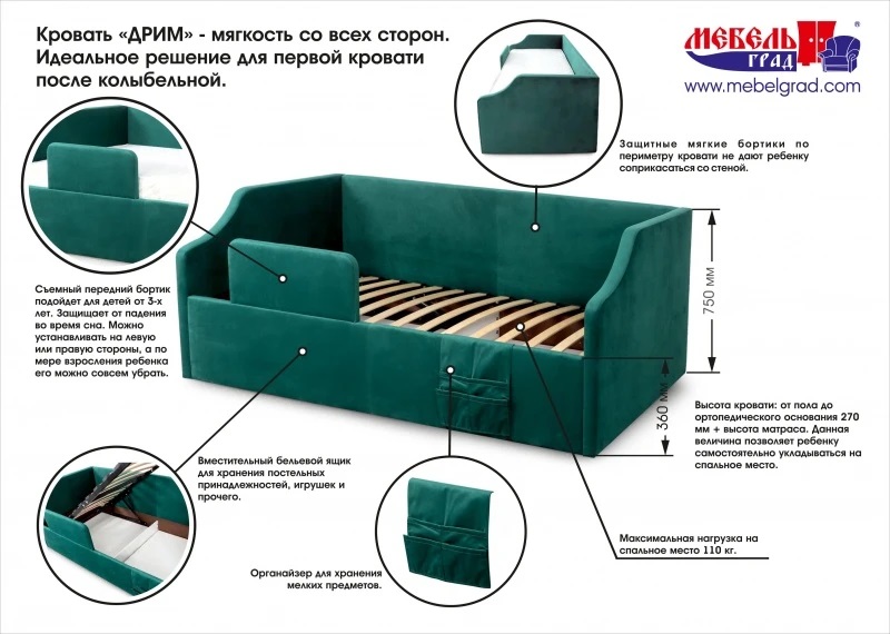 Кровать “Дрим” - это идеальное решение для детской комнаты. Мягкая обивка из приятного на ощупь, гипоаллергенного велюра обеспечивает комфорт и уют во время сна.