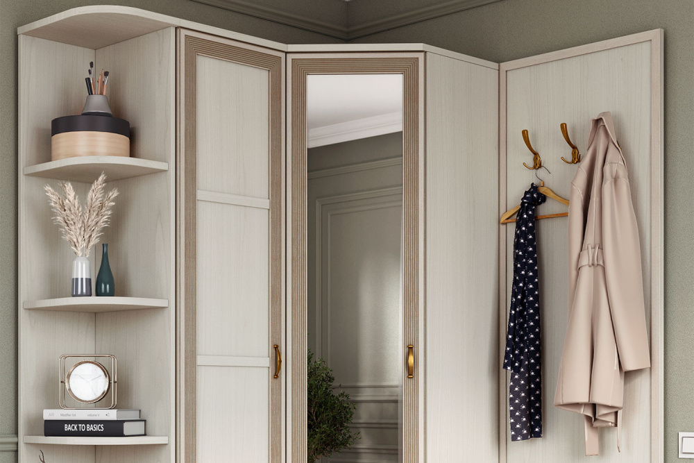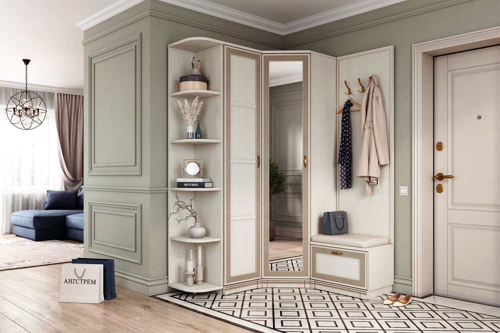 • Вместительные шкафы и вешалка позволят разместить одежду, тумбочка сохранит в чистоте обувь, а аксессуары на стеллаже подчеркнут выбранный стиль интерьера.