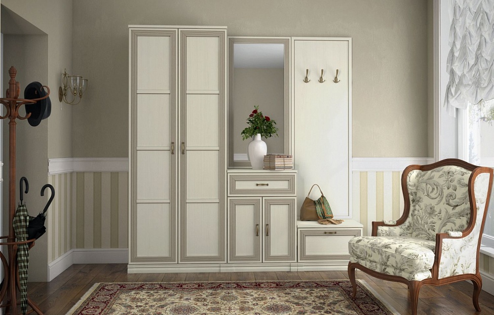 Классическая композиция №6 коллекции "Адажио" – эталон строгости и элегантности. Двустворчатый удобный шкаф с евровешалкой и полками, вместительный комод, тумба для обуви, вешалки – все создано для удобного хранения.