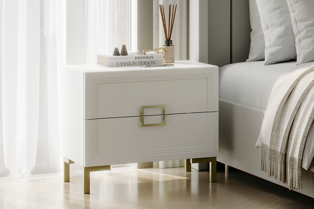 Основу дизайна составляет геометрический символ — квадрат. Это видно по золотым матовым ручкам на тумбе и столе;