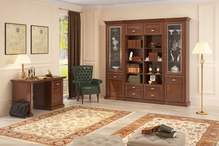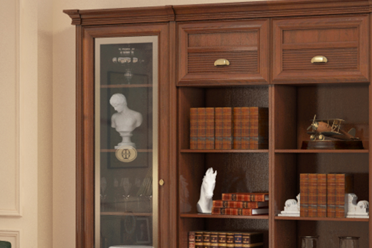 В Композиции №1 удивительно сочетаются строгая классика и элегантная изысканность. В шкафах со стеклянными фасадами Вы можете удобно разместить посуду, а также сувениры и другие хрупкие красивые мелочи, а центр композиции из полок и выдвижных ящиков уникального цвета "Старый клён" наполнить любимыми книгами.