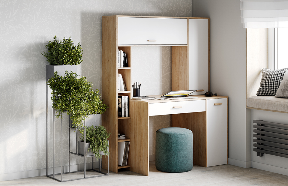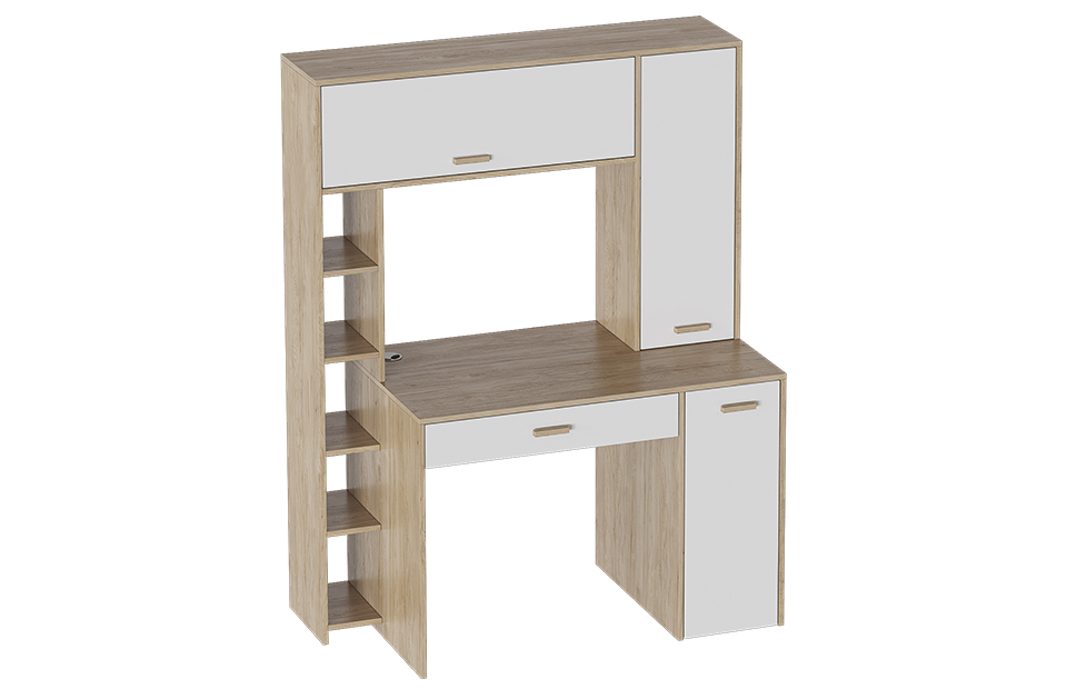 Внутреннее пространство стола разделено на 3 закрытых зоны: правая зона оснащена 1 съемной и 3 жесткими полками. Левая зона представлена в виде открытой ниши с полками. Верхнее отделение разделено на 2 части перегородкой. Под столешницей расположен ящик на шариковых направляющих.