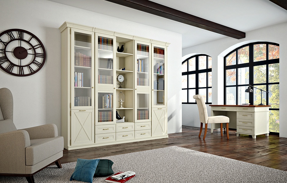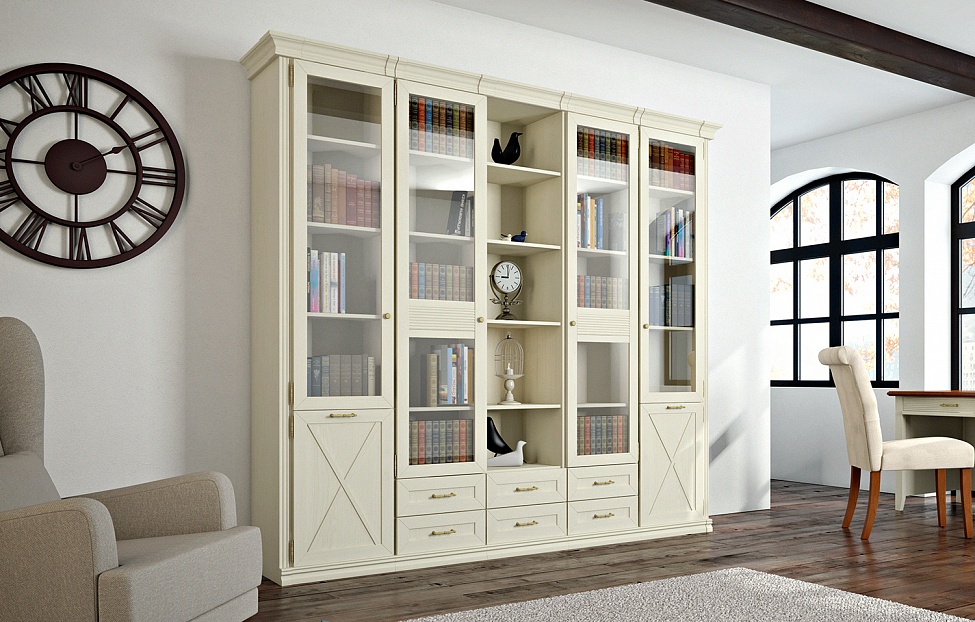 Фасады - рамочной конструкции из профиля МДФ, окутанного бумагой с «финиш-эффектом», в «глухих» фасадах вставки из ЛДСП 6 мм, в фасадах со стеклом - вставки из прозрачного стекла;
