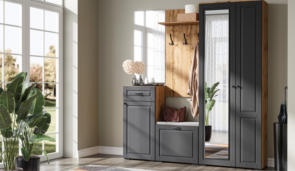 Прихожая Лацио Сканди, оборудованная полноценной системой хранения, предлагает множество модулей для эффективного использования пространства. Шкафы с зеркальными и глухими фасадами добавляют стиль и функциональность, позволяя проверить свой образ перед выходом и удобно хранить вещи. Декоры, повторяющие текстуру натурального дерева, придают интерьеру прихожей уют и тепло, создавая гармоничную атмосферу. Внутренняя сторона фасадов в цвете графит совпадает по цвету с внешней, что придает прихожей премиальный вид.