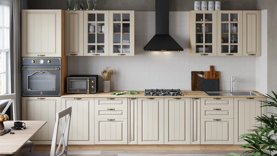 Кухня «Лина» выполнена в классическом французском стиле. Изящность и аристократизм каждой линии фасада придадут помещению неповторимый шик. Цветовая гамма и тональность этой кухни сдержанная, нейтральная, будет прекрасно сочетаться с любыми оттенками в оформлении интерьера и идеально подойдет как для маленьких, так и для просторных помещений. Кухня покорит любителей современной классики, удачно сочетая в себе очарование классических элементов, функциональность и гармоничные пропорции.