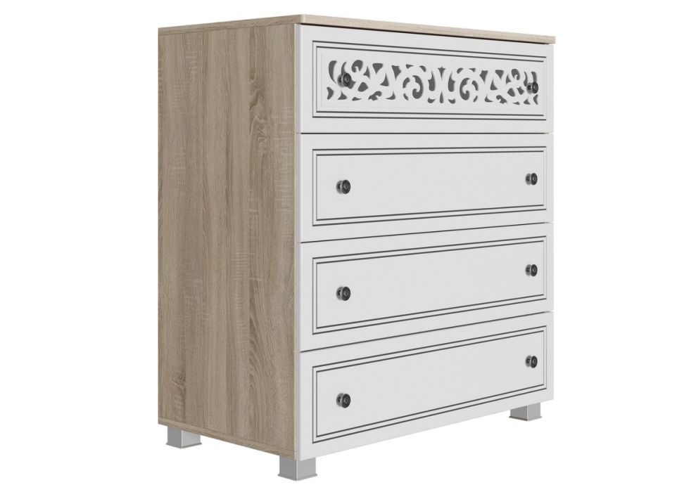 Материал: ЛДСП, МДФ Комод оснащен 4мя ящиками на шариковых направляющих полного выдвижения.