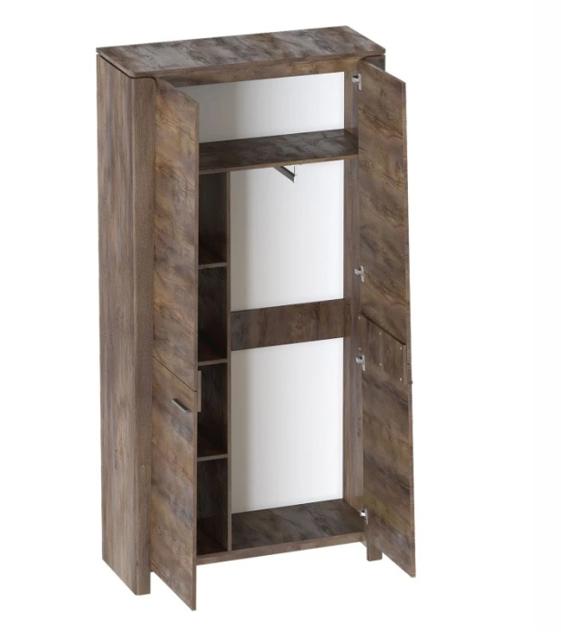Внутреннее пространство шкафа разделено полкой на платяное с продольной стальной штангой и верхнее отделение для хранения белья. Фасады выполнены из МДФ, преимуществами данного материала являются влагостойкость, экологичность, гипоаллергенность, надёжность и долгий срок эксплуатации.