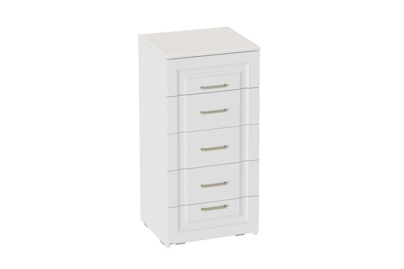 Комод выполнен в цвете Айс 06 / Белый Аляска. Классическая фрезеровка фасадов и ручки-скобы из брашированного золота придают изделию особый шарм и элегантность. Ящики полного выдвижения на шариковых направляющих скользят бесшумно и плавно. Дно и задние стенки выполнены из ХДФ. На опорах размещены войлочные подпятники.