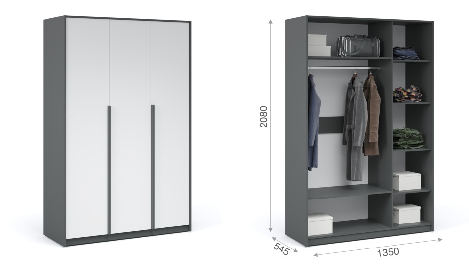 Функциональный распашной шкаф с массивными ручками контрастного цвета включает в себя вместительные полки и отделения со штангой, что позволяет создать систему для хранения вещей различного назначения. Встраиваемая в портал LED подсветка – оригинальное дизайнерское решение и дополнительный источник освещения. Современные цвета декора корпуса и белоснежный фасад добавят в жилое помещение света, уюта и комфорта. Идеально компонуется со всеми модулями системы Мишель.